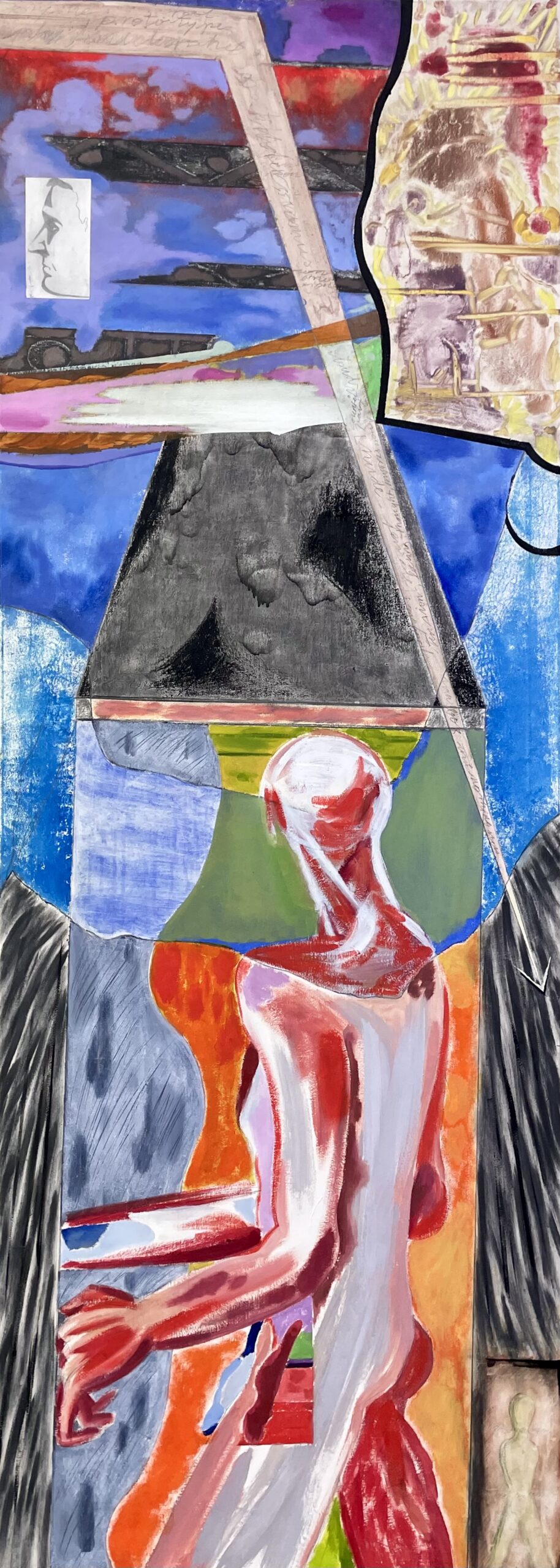 framework / complete contemplationoil, pencil, pigment, chalk and paper on canvas, 70cmx195cm, 2023 << door ( right side ) – the group >> portrait ( distorted ) I