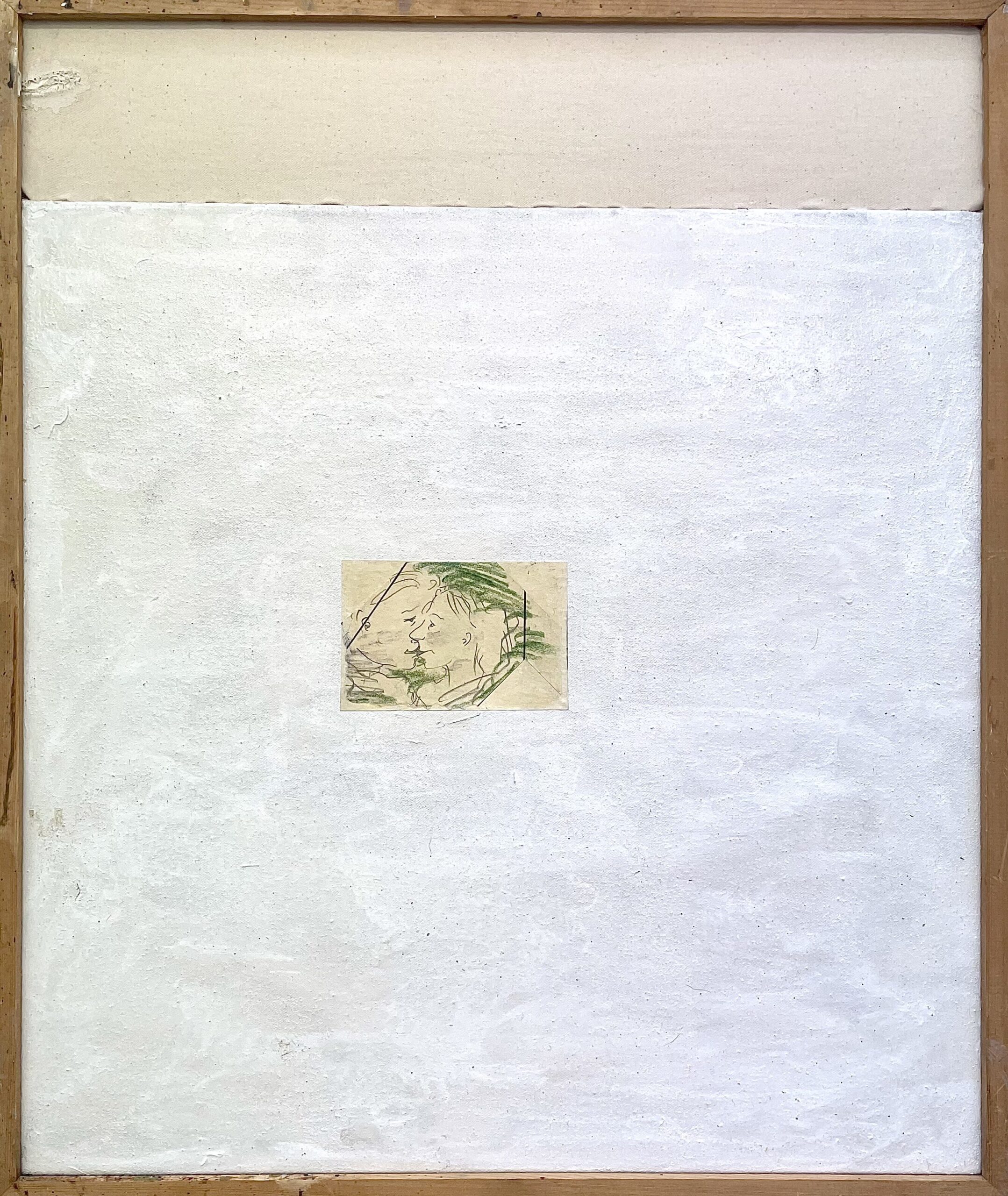 kissoil, pencil, paper, varnish and lacquer on canvas, wooden frame, textile, 52cmx62cm, 2023 << kiss / echo >> feed
