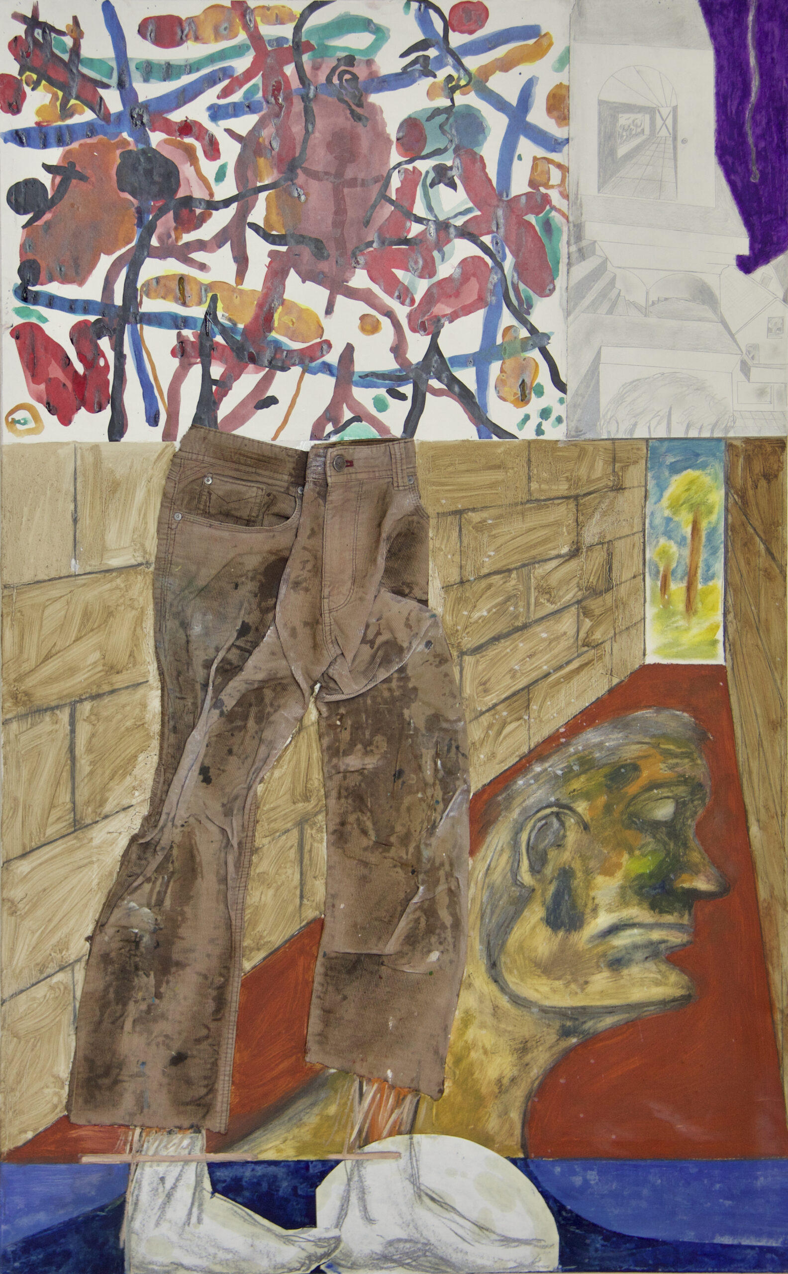man / where are you going?oil, penciln artist’s pants, ink and paper on canvas, 90cmx145cm, 2023 << walking man ( inside – outside ) >> mirror painting