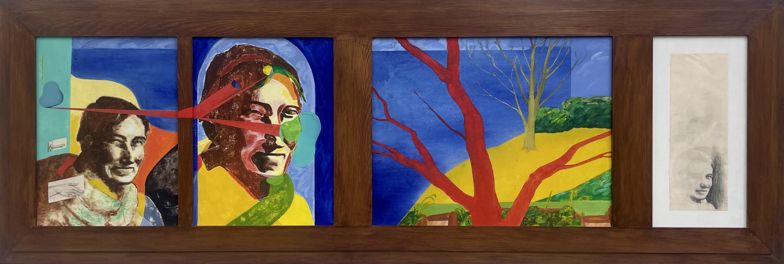 three canvases and drawing in artist frame, oil, paper and pencil on canvas, pencil on paper, wooden frame, 30cmx40cm/30cmx40cm/50cmx40cm/12cmx32cm, 2023