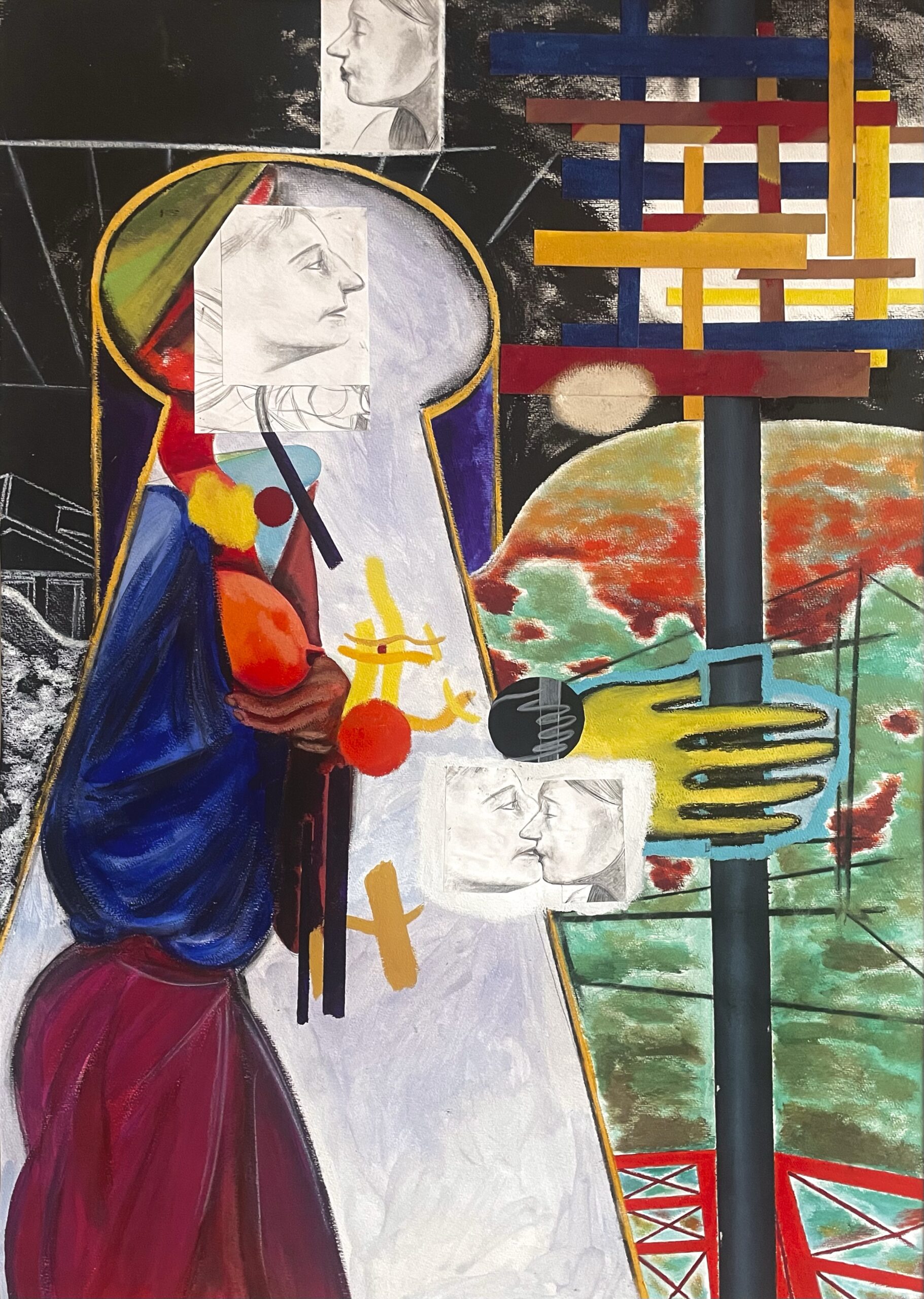 the kiss / der kussacrylic, chalk, prints, paper and charcol on paper, 2023 << the poet’s bones >> construction/ exploration/ collapse